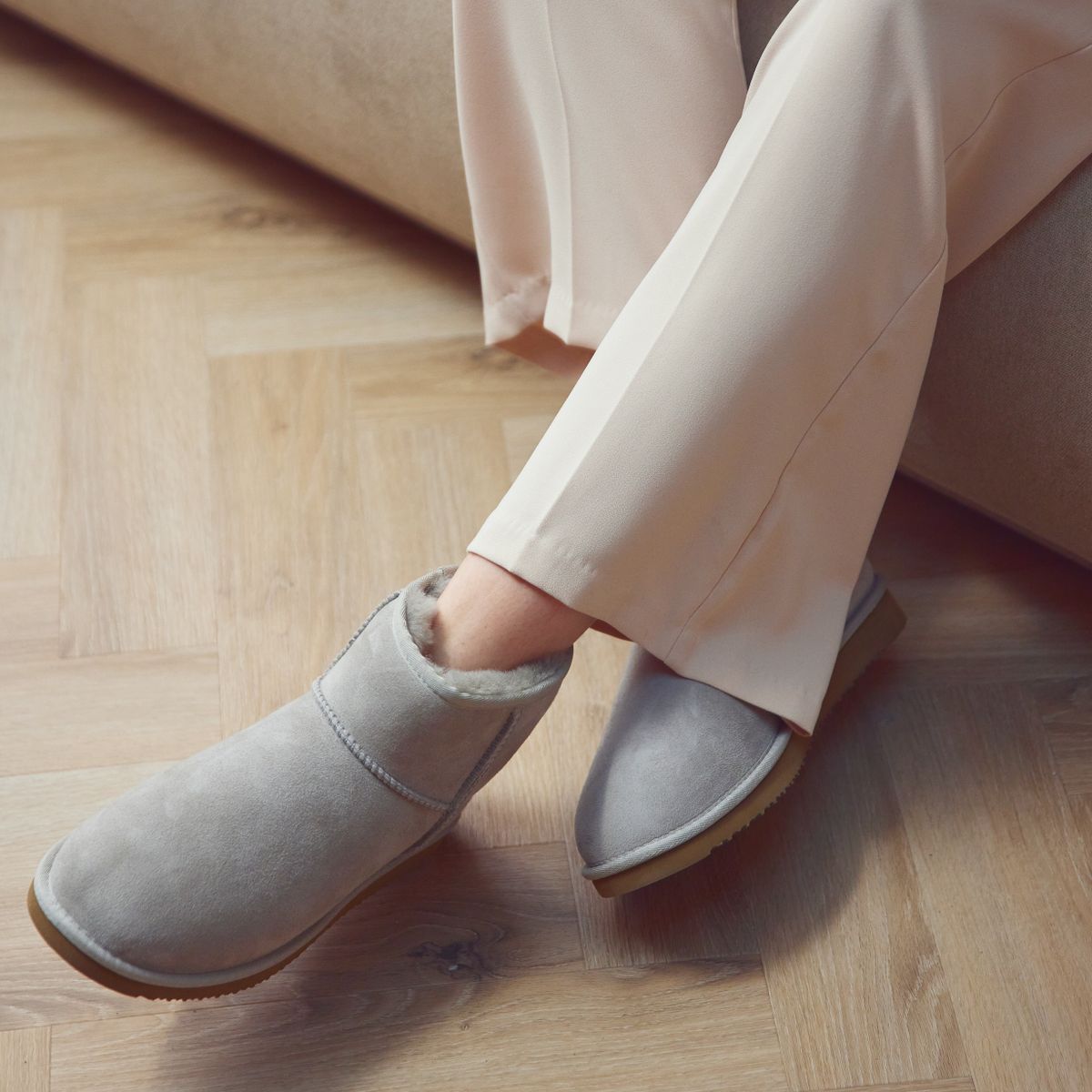 100% Schaffell/Lammfell, Double Face Schaffell/Lammfell, EVA-Laufsohle (natürlich dehnbares, gummiartiges Material), Wildleder